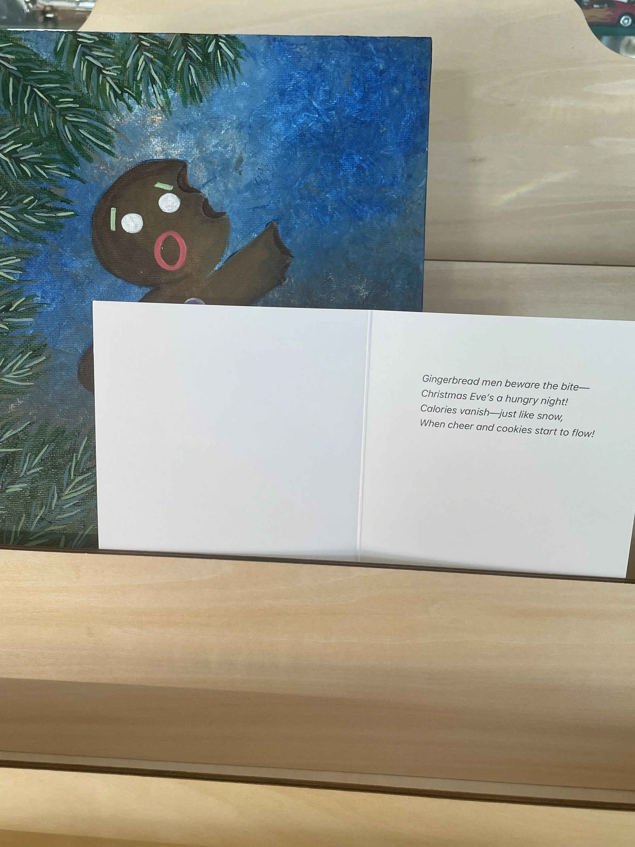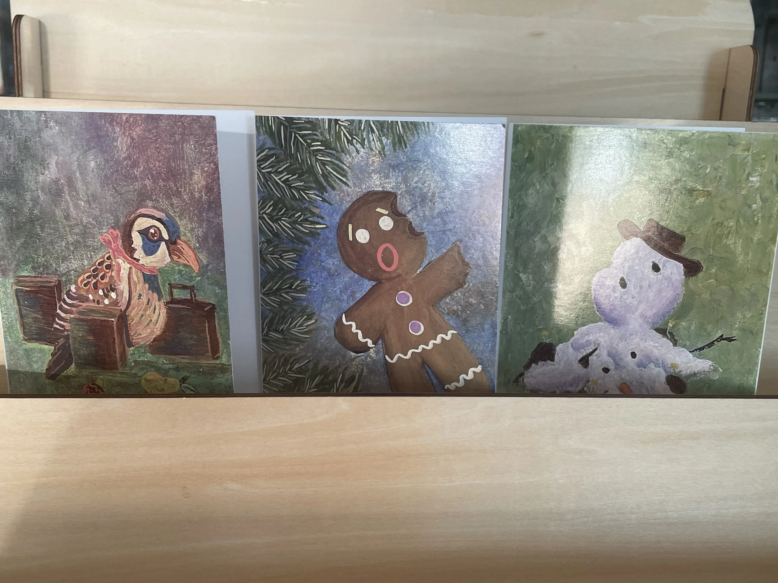 Celebrate the season with this charming set of 12 Christmas cards, each measuring 5.5 x 4 inches. Featuring delightful holiday illustrations—a festive partridge, a melting snowman, and a cheerful gingerbread man—these cards bring warmth and whimsy to your holiday greetings. Each card comes with a matching envelope, making them ready to send heartfelt messages to loved ones. Perfect for sharing holiday cheer in a unique and artistic way.
